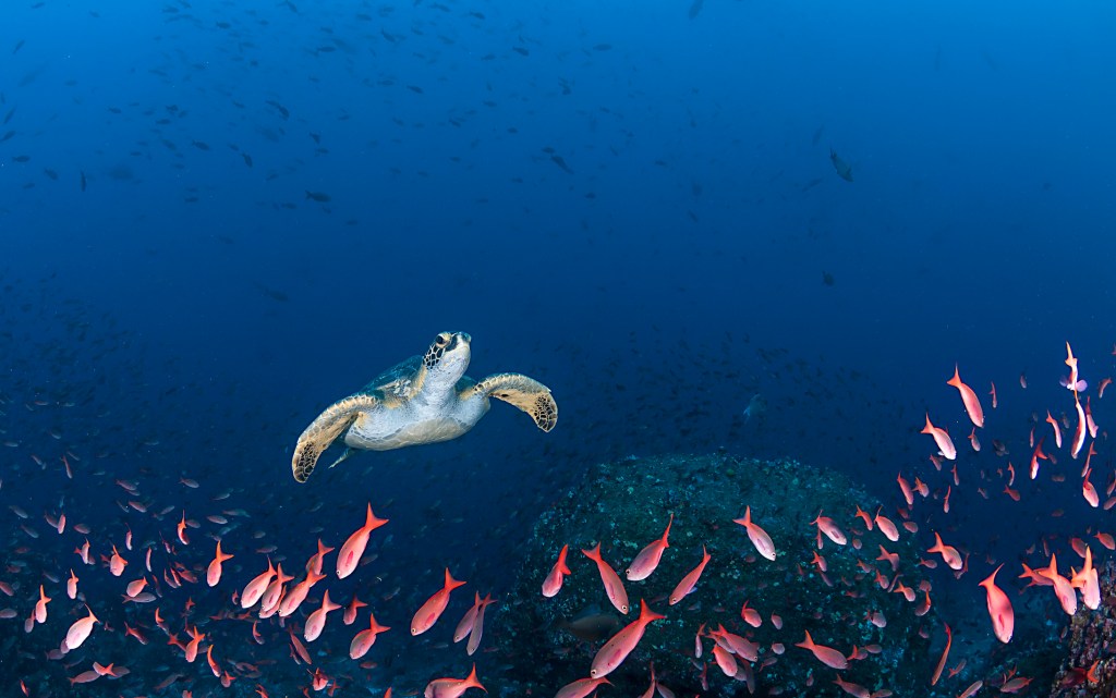 What you’ll see: Tuna, big-eye trevallies, barracuda, snapper, wahoo, bump head parrotfish, scorpionfish, lionfish, anemonefish, sea turtles, Napoleon wrasse, and reef sharks