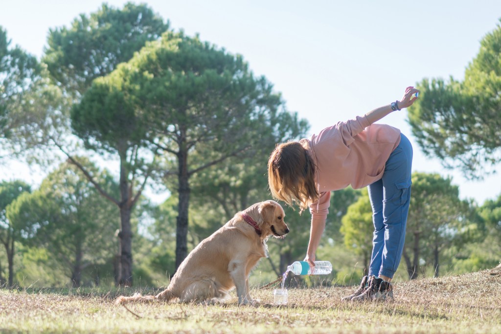 Extreme heat, cold, or rapidly changing temperatures can harm your dog’s health—just like it would yours, if you didn’t dress or pack layers. Outfitting your pup with a cooling jacket or a trail-worthy coat is an option—just make sure you think of it before you set out. If terrain might be icy, snowy or muddy, you may even want to train your dog to walk in hiking shoes before you hit the trails.
