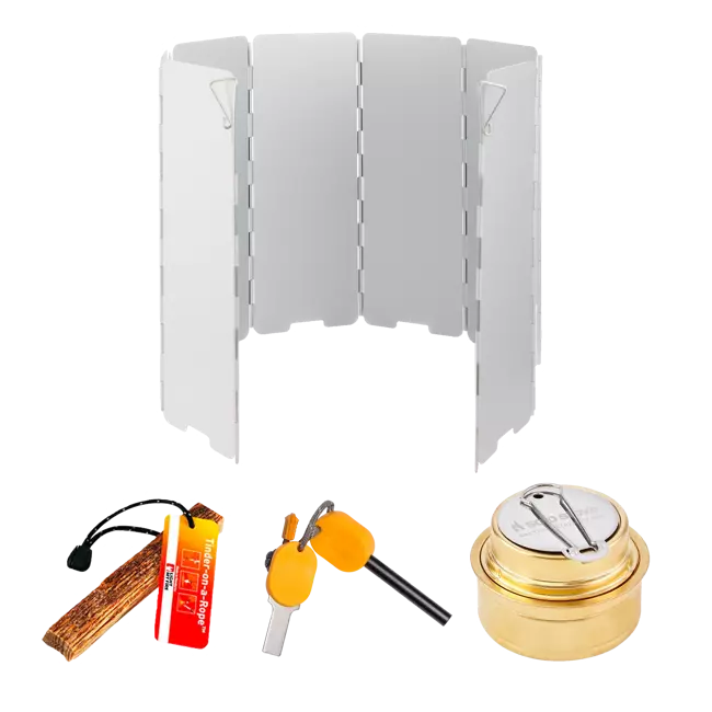 This accessory kit is meant to keep you prepared for any camping stove needs. The windscreen is a great accessory for those breezy spring evenings, and the fire striker and tinder on a rope will help you keep the fire going.